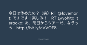 寺岡呼人 @yohito_teraoka – 23:35・2010年5月20日 2010 5/20 寺岡呼人 2010-05-20 今日は休めたの?(笑)RT @lovemart: ですです!楽しみ! RT @yohito_teraoka: あ、明日からツアーだ、なうぅぅ http://bit.ly/cVVOF8 Source:https://x.com/yohito_teraoka/status/14365049094 text X Post 寺岡呼人 寺岡呼人 この記事が気に入ったら フォローしてね! Follow @OtokoTimes1988 よかったらシェアしてね! URLをコピーしました! 寺岡呼人 @yohito_teraoka - 23:31・2010年5月20日 寺岡呼人 @yohito_teraoka - 23:38・2010年5月20日 関連記事 Artist 寺岡呼人 1968.02.07