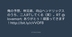 寺岡呼人 @yohito_teraoka – 23:42・2010年5月20日 2010 5/20 寺岡呼人 2010-05-20 俺の予想、林兄弟、向山ヘンドリックスのうち、二人RTしてくる(笑)。RT @lovemart: ありがとぅ!頑張ってきます!http://bit.ly/cVVOF8 Source:https://x.com/yohito_teraoka/status/14365416664 text X Post 寺岡呼人 寺岡呼人 この記事が気に入ったら フォローしてね! Follow @OtokoTimes1988 よかったらシェアしてね! URLをコピーしました! 寺岡呼人 @yohito_teraoka - 23:38・2010年5月20日 寺岡呼人 @yohito_teraoka - 23:47・2010年5月20日 関連記事 Artist 寺岡呼人 1968.02.07