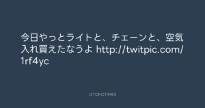 寺岡呼人 @yohito_teraoka – 12:24・2010年5月27日 2010 5/27 寺岡呼人 2010-05-27 今日やっとライトと、チェーンと、空気入れ買えたなうよ http://twitpic.com/1rf4yc Source:https://x.com/yohito_teraoka/status/14809239696 text X Post 寺岡呼人 寺岡呼人 この記事が気に入ったら フォローしてね! Follow @OtokoTimes1988 よかったらシェアしてね! URLをコピーしました! 寺岡呼人 @yohito_teraoka - 12:08・2010年5月27日 寺岡呼人 @yohito_teraoka - 12:28・2010年5月27日 関連記事 Artist 寺岡呼人 1968.02.07