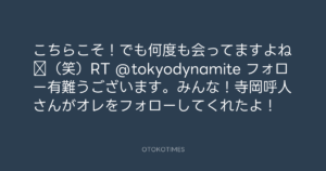 寺岡呼人 @yohito_teraoka – 13:18・2010年5月27日 2010 5/27 寺岡呼人 2010-05-27 こちらこそ!でも何度も会ってますよね⁇(笑)RT @tokyodynamite フォロー有難うございます。みんな!寺岡呼人さんがオレをフォローしてくれたよ! Source:https://x.com/yohito_teraoka/status/14812104192 text X Post 寺岡呼人 寺岡呼人 この記事が気に入ったら フォローしてね! Follow @OtokoTimes1988 よかったらシェアしてね! URLをコピーしました! 寺岡呼人 @yohito_teraoka - 12:28・2010年5月27日 寺岡呼人 @yohito_teraoka - 13:37・2010年5月27日 関連記事 Artist 寺岡呼人 1968.02.07