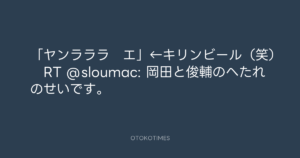 寺岡呼人 @yohito_teraoka – 0:08・2010年5月28日 2010 5/28 寺岡呼人 2010-05-28 「ヤンラララ エ」←キリンビール(笑) RT @sloumac: 岡田と俊輔のへたれのせいです。 Source:https://x.com/yohito_teraoka/status/14840433131 text X Post 寺岡呼人 寺岡呼人 この記事が気に入ったら フォローしてね! Follow @OtokoTimes1988 よかったらシェアしてね! URLをコピーしました! 寺岡呼人 @yohito_teraoka - 23:29・2010年5月27日 寺岡呼人 @yohito_teraoka - 8:41・2010年5月28日 関連記事 Artist 寺岡呼人 1968.02.07