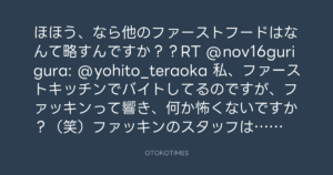 ほほう、なら他のファーストフードはなんて略すんですか??RT @nov16gurigura: @yohito_teraoka 私、ファーストキッチンでバイトしてるのですが、ファッキンって響き、何か怖くないですか?(笑)ファッキンのスタッフはあまり使いません(笑)