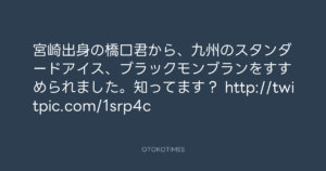 寺岡呼人 @yohito_teraoka – 23:53・2010年5月31日 2010 5/31 寺岡呼人 2010-05-31 宮崎出身の橋口君から、九州のスタンダードアイス、ブラックモンブランをすすめられました。知ってます? http://twitpic.com/1srp4c Source:https://x.com/yohito_teraoka/status/15112313881 text X Post 寺岡呼人 寺岡呼人 この記事が気に入ったら フォローしてね! Follow @OtokoTimes1988 よかったらシェアしてね! URLをコピーしました! 寺岡呼人 @yohito_teraoka - 23:49・2010年5月31日 寺岡呼人 @yohito_teraoka - 0:47・2010年6月1日 関連記事 Artist 寺岡呼人 1968.02.07