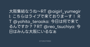 大阪集結なうね〜RT @aigirl_yumegirl: こちらはライブで来ておりまーす! RT @yohito_teraoka: 今日は何で来てるんですか??RT @reo_tsuchiya: 今日はみんな大阪にいるなぁ