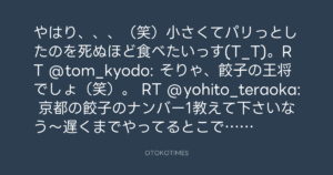 やはり、、、(笑)小さくてパリっとしたのを死ぬほど食べたいっす(T_T)。RT @tom_kyodo: そりゃ、餃子の王将でしょ(笑)。 RT @yohito_teraoka: 京都の餃子のナンバー1教えて下さいなう〜遅くまでやってるとこで(>人<;)