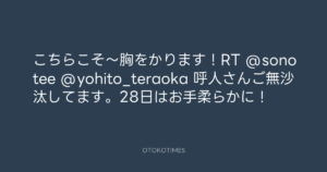 こちらこそ〜胸をかります!RT @sonotee @yohito_teraoka 呼人さんご無沙汰してます。28日はお手柔らかに!
