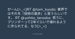 がーん(>_<)RT @tom_kyodo: 業界ではそれを「技術の進歩」と言うらしいです。 RT @yohito_teraoka: 思うに、プリンターって2年ぐらいで壊れるように作られてる、なう(>_<)