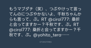 もうマブダチ(笑)、つぶやけって言ってんのにつぶやかないよ、千秋ちゃんからも言って、ぷ。RT @cirol777: 桑折と会ってますかー?千秋です、ぷ。RT @cirol777: 桑折と会ってますかー?千秋です、ぷ。@yohito_teraoka
