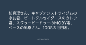寺岡呼人 @yohito_teraoka – 11:07・2010年6月30日 2010 6/30 寺岡呼人 2010-06-30 杉真理さん、キャプテンストライダムの永友君、ビートクルセイダースのカトウ君、スクゥービードゥーのMOBY君、ベースの風祭さん、100Sの池田君。 Source:https://x.com/yohito_teraoka/status/17380057079 text X Post 寺岡呼人 寺岡呼人 この記事が気に入ったら フォローしてね! Follow @OtokoTimes1988 よかったらシェアしてね! URLをコピーしました! 寺岡呼人 @yohito_teraoka - 11:06・2010年6月30日 寺岡呼人 @yohito_teraoka - 12:38・2010年7月1日 関連記事 Artist 寺岡呼人 1968.02.07