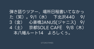 寺岡呼人 @yohito_teraoka – 13:16・2010年7月1日 2010 7/01 寺岡呼人 2010-07-01 弾き語りツアー、場所日程書いてなかった(笑)。9/1(水) 下北沢440 9/3(金) 心斎橋JANUS(ジャニス) 9/4(土) 京都SOLE CAFÉ 9/8(木) 本八幡ルート14 よろしくぅ。 Source:https://x.com/yohito_teraoka/status/17467214531 text X Post 寺岡呼人 寺岡呼人 この記事が気に入ったら フォローしてね! Follow @OtokoTimes1988 よかったらシェアしてね! URLをコピーしました! 寺岡呼人 @yohito_teraoka - 12:39・2010年7月1日 寺岡呼人 @yohito_teraoka - 16:30・2010年7月1日 関連記事 Artist 寺岡呼人 1968.02.07