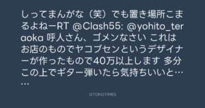 しってまんがな(笑)でも置き場所こまるよねーRT @Clash55: @yohito_teraoka 呼人さん、ゴメンなさい これはお店のものでヤコブセンというデザイナーが作ったもので40万以上します 多分この上でギター弾いたら気持ちいいとは思います。