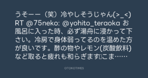 うそーー(笑)冷やしそうじゃん(>_<)RT @75neko: @yohito_teraoka お風呂に入った時、必ず湯舟に浸かって下さい。冷房で身体弱ってるのを温めた方が良いです。酢の物やレモン(炭酸飲料)など取ると疲れも和らぎます☆こまめに水分補給も欠かさずに(^ω^)