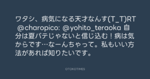 ワタシ、病気になる天才なんす(T_T)RT @charopico: @yohito_teraoka 自分は夏バテじゃないと信じ込む!病は気からです…なーんちゃって。私もいい方法があれば知りたいです。