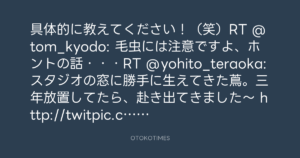 具体的に教えてください!(笑)RT @tom_kyodo: 毛虫には注意ですよ、ホントの話・・・RT @yohito_teraoka: スタジオの窓に勝手に生えてきた蔦。三年放置してたら、赴き出てきました〜 http://twitpic.com/26g1wv