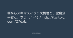 寺岡呼人 @yohito_teraoka – 12:39・2010年7月21日 2010 7/21 寺岡呼人 2010-07-21 朝からスキマスイッチ大橋君と、堂島公平君と、なう(^ー^)ノ http://twitpic.com/276xlz Source:https://x.com/yohito_teraoka/status/19046937867 text X Post 寺岡呼人 寺岡呼人 この記事が気に入ったら フォローしてね! Follow @OtokoTimes1988 よかったらシェアしてね! URLをコピーしました! 寺岡呼人 @yohito_teraoka - 1:29・2010年7月20日 寺岡呼人 @yohito_teraoka - 15:54・2010年7月21日 関連記事 Artist 寺岡呼人 1968.02.07