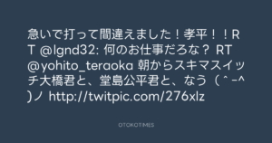 急いで打って間違えました!孝平!!RT @lgnd32: 何のお仕事だろな? RT @yohito_teraoka 朝からスキマスイッチ大橋君と、堂島公平君と、なう(^ー^)ノ http://twitpic.com/276xlz