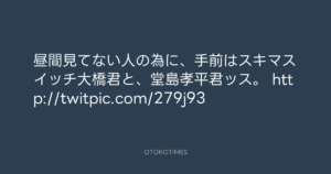 昼間見てない人の為に、手前はスキマスイッチ大橋君と、堂島孝平君ッス。 http://twitpic.com/279j93