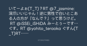 いてーよぉ(T_T)?RT @7_jasmine: 深爪いいじゃん!逆に男性で白いとこある人の方が『なんで?』って思うけど。 RT @iSSEi_iSHiDA みーとぅーです…ぐす。RT @yohito_teraoka ぐすん(T_T)RT @yumekibundeiko