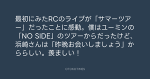 寺岡呼人 @yohito_teraoka – 1:22・2010年8月4日 2010 8/04 寺岡呼人 2010-08-04 最初にみたRCのライブが「サマーツアー」だったことに感動。僕はユーミンの「NO SIDE」のツアーからだったけど、浜崎さんは「昨晩お会いしましょう」かららしい。羨ましい! Source:https://x.com/yohito_teraoka/status/20233344706 text X Post 寺岡呼人 寺岡呼人 この記事が気に入ったら フォローしてね! Follow @OtokoTimes1988 よかったらシェアしてね! URLをコピーしました! 寺岡呼人 @yohito_teraoka - 1:19・2010年8月4日 寺岡呼人 @yohito_teraoka - 12:07・2010年8月4日 関連記事 Artist 寺岡呼人 1968.02.07