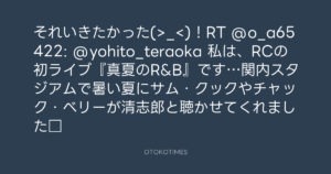 それいきたかった(>_<)!RT @o_a65422: @yohito_teraoka 私は、RCの初ライブ『真夏のR&B』です…関内スタジアムで暑い夏にサム・クックやチャック・ベリーが清志郎と聴かせてくれました□