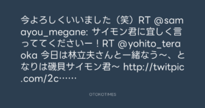 今よろしくいいました(笑)RT @samayou_megane: サイモン君に宜しく言っててくださいー!RT @yohito_teraoka 今日は林立夫さんと一緒なう〜、となりは磯貝サイモン君〜 http://twitpic.com/2c17y7