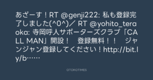 あざーす!RT @genji222: 私も登録完了しました(^0^)/ RT @yohito_teraoka: 寺岡呼人サポーターズクラブ「CALL MAN」開設! 登録無料!! ジャンジャン登録してください!http://bit.ly/bsmoAS