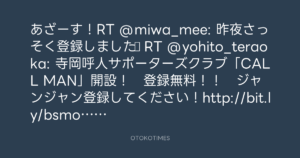 あざーす!RT @miwa_mee: 昨夜さっそく登録しました♪ RT @yohito_teraoka: 寺岡呼人サポーターズクラブ「CALL MAN」開設! 登録無料!! ジャンジャン登録してください!http://bit.ly/bsmoAS