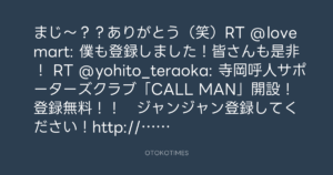 まじ〜??ありがとう(笑)RT @lovemart: 僕も登録しました!皆さんも是非! RT @yohito_teraoka: 寺岡呼人サポーターズクラブ「CALL MAN」開設! 登録無料!! ジャンジャン登録してください!http://bit.ly/bsmoAS