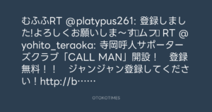 むふふRT @platypus261: 登録しました!よろしくお願いしま~す♪ムフ♪ RT @yohito_teraoka: 寺岡呼人サポーターズクラブ「CALL MAN」開設! 登録無料!! ジャンジャン登録してください!http://bit.ly/bsmoAS