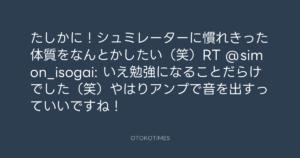 寺岡呼人 @yohito_teraoka – 0:20・2010年8月7日 2010 8/07 寺岡呼人 2010-08-07 たしかに!シュミレーターに慣れきった体質をなんとかしたい(笑)RT @simon_isogai: いえ勉強になることだらけでした(笑)やはりアンプで音を出すっていいですね! Source:https://x.com/yohito_teraoka/status/20476819779 text X Post 寺岡呼人 寺岡呼人 この記事が気に入ったら フォローしてね! Follow @OtokoTimes1988 よかったらシェアしてね! URLをコピーしました! 寺岡呼人 @yohito_teraoka - 0:14・2010年8月7日 寺岡呼人 @yohito_teraoka - 0:21・2010年8月7日 関連記事 Artist 寺岡呼人 1968.02.07
