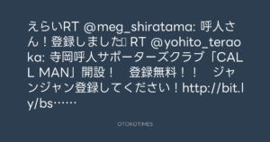 えらいRT @meg_shiratama: 呼人さん!登録しました☆ RT @yohito_teraoka: 寺岡呼人サポーターズクラブ「CALL MAN」開設! 登録無料!! ジャンジャン登録してください!http://bit.ly/bsmoAS