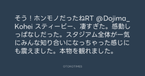 寺岡呼人 @yohito_teraoka – 21:54・2010年8月8日 2010 8/08 寺岡呼人 2010-08-08 そう!ホンモノだったねRT @Dojima_Kohei スティービー、凄すぎた。感動しっぱなしだった。スタジアム全体が一気にみんな知り合いになっちゃった感じにも震えました。本物を観れました。 Source:https://x.com/yohito_teraoka/status/20626377587 text X Post 寺岡呼人 寺岡呼人 この記事が気に入ったら フォローしてね! Follow @OtokoTimes1988 よかったらシェアしてね! URLをコピーしました! 寺岡呼人 @yohito_teraoka - 21:44・2010年8月8日 寺岡呼人 @yohito_teraoka - 22:02・2010年8月8日 関連記事 Artist 寺岡呼人 1968.02.07