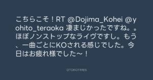 寺岡呼人 @yohito_teraoka – 22:02・2010年8月8日 2010 8/08 寺岡呼人 2010-08-08 こちらこそ!RT @Dojima_Kohei @yohito_teraoka 凄まじかったですね。。ほぼノンストップなライヴですし。もう、一曲ごとにKOされる感じでした。今日はお疲れ様でした~! Source:https://x.com/yohito_teraoka/status/20626814627 text X Post 寺岡呼人 寺岡呼人 この記事が気に入ったら フォローしてね! Follow @OtokoTimes1988 よかったらシェアしてね! URLをコピーしました! 寺岡呼人 @yohito_teraoka - 21:54・2010年8月8日 寺岡呼人 @yohito_teraoka - 22:08・2010年8月8日 関連記事 Artist 寺岡呼人 1968.02.07