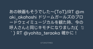 あの映画もそうでした〜(ToT)/RT @maki_akahoshi ドリームガールズのブロードウェイミュージカルを観た時、今の呼人さんと同じキモチになりました♪( ´▽`) RT @yohito_teraoka 確かに!