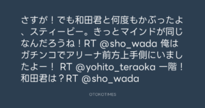 さすが!でも和田君と何度もかぶったよ、スティービー。きっとマインドが同じなんだろうね!RT @sho_wada 俺はガチンコでアリーナ前方上手側にいましたよー! RT @yohito_teraoka 一階!和田君は?RT @sho_wada
