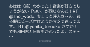 あはは(笑)わかった!音楽が好きでしょうがない「匂い」が同じなんだ!RT @sho_wada: ちょっと呼人さ〜ん。後ろ髪にビーズ付けようかマジで迷ってます。 RT @yohito_teraoka さすが!でも和田君と何度もかぶったよ、スティービー。