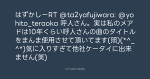 はずかしーRT @ta2yafujiwara: @yohito_teraoka 呼人さん。実は私のメアドは10年くらい呼人さんの曲のタイトルをまんま使用させて頂いてます(照)(*^_^*)気に入りすぎて他社ケータイに出来ません(笑)