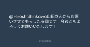 寺岡呼人 @yohito_teraoka – 21:32・2010年8月12日 2010 8/12 寺岡呼人 2010-08-12 @HiroshiShinkawa山田さんからお願いさせてもらった寺岡です。今後ともよろしくお願いいたします! Source:https://x.com/yohito_teraoka/status/20971269889 text X Post 寺岡呼人 寺岡呼人 この記事が気に入ったら フォローしてね! Follow @OtokoTimes1988 よかったらシェアしてね! URLをコピーしました! 寺岡呼人 @yohito_teraoka - 18:34・2010年8月12日 寺岡呼人 @yohito_teraoka - 0:18・2010年8月13日 関連記事 Artist 寺岡呼人 1968.02.07