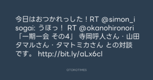 今日はおつかれっした!RT @simon_isogai: うほっ! RT @okanohironori 「一期一会 その4」 寺岡呼人さん・山田タマルさん・タマトミカさん との対談です。 http://bit.ly/aLx6cI