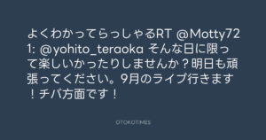 寺岡呼人 @yohito_teraoka – 1:56・2010年8月14日 2010 8/14 寺岡呼人 2010-08-14 よくわかってらっしゃるRT @Motty721: @yohito_teraoka そんな日に限って楽しいかったりしませんか?明日も頑張ってください。9月のライブ行きます!チバ方面です! Source:https://x.com/yohito_teraoka/status/21079644935 text X Post 寺岡呼人 寺岡呼人 この記事が気に入ったら フォローしてね! Follow @OtokoTimes1988 よかったらシェアしてね! URLをコピーしました! 寺岡呼人 @yohito_teraoka - 1:55・2010年8月14日 寺岡呼人 @yohito_teraoka - 2:39・2010年8月14日 関連記事 Artist 寺岡呼人 1968.02.07