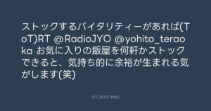 寺岡呼人 @yohito_teraoka – 20:12・2010年8月16日 2010 8/16 寺岡呼人 2010-08-16 ストックするバイタリティーがあれば(ToT)RT @RadioJYO @yohito_teraoka お気に入りの飯屋を何軒かストックできると、気持ち的に余裕が生まれる気がします(笑) Source:https://x.com/yohito_teraoka/status/21306474769 text X Post 寺岡呼人 寺岡呼人 この記事が気に入ったら フォローしてね! Follow @OtokoTimes1988 よかったらシェアしてね! URLをコピーしました! 寺岡呼人 @yohito_teraoka - 19:55・2010年8月16日 寺岡呼人 @yohito_teraoka - 20:32・2010年8月16日 関連記事 Artist 寺岡呼人 1968.02.07