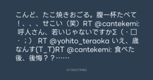 こんど、たこ焼きおごる。腹一杯たべて!、、、せこい(笑)RT @cantekemi: 呼人さん、若いじゃないですかΣ(・□・;) RT @yohito_teraoka いえ、歳なんす(T_T)RT @cantekemi: 食べた後、後悔??けっこう重い感じなんですね!(◎_◎;)