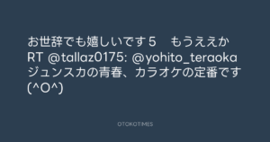 寺岡呼人 @yohito_teraoka – 2:08・2010年8月17日 2010 8/17 寺岡呼人 2010-08-17 お世辞でも嬉しいです5 もうええか RT @tallaz0175: @yohito_teraoka ジュンスカの青春、カラオケの定番です(^O^) Source:https://x.com/yohito_teraoka/status/21330436304 text X Post 寺岡呼人 寺岡呼人 この記事が気に入ったら フォローしてね! Follow @OtokoTimes1988 よかったらシェアしてね! URLをコピーしました! 寺岡呼人 @yohito_teraoka - 1:50・2010年8月17日 寺岡呼人 @yohito_teraoka - 1:45・2010年8月18日 関連記事 Artist 寺岡呼人 1968.02.07