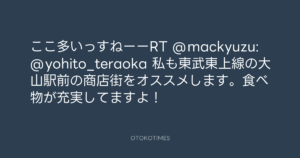 寺岡呼人 @yohito_teraoka – 10:04・2010年8月21日 2010 8/21 寺岡呼人 2010-08-21 ここ多いっすねーーRT @mackyuzu: @yohito_teraoka 私も東武東上線の大山駅前の商店街をオススメします。食べ物が充実してますよ! Source:https://x.com/yohito_teraoka/status/21709022898 text X Post 寺岡呼人 寺岡呼人 この記事が気に入ったら フォローしてね! Follow @OtokoTimes1988 よかったらシェアしてね! URLをコピーしました! 寺岡呼人 @yohito_teraoka - 10:03・2010年8月21日 寺岡呼人 @yohito_teraoka - 10:06・2010年8月21日 関連記事 Artist 寺岡呼人 1968.02.07