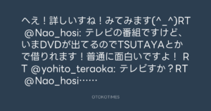 へえ!詳しいすね!みてみます(^_^)RT @Nao_hosi: テレビの番組ですけど、いまDVDが出てるのでTSUTAYAとかで借りれます!普通に面白いですよ! RT @yohito_teraoka: テレビすか?RT @Nao_hosi: もやもやさまーず見てみたらどうですか