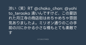寺岡呼人 @yohito_teraoka – 16:23・2010年8月21日 2010 8/21 寺岡呼人 2010-08-21 渋い(笑)RT @chako_chan: @yohito_teraoka 遠いんですけど、この夏訪れた月江寺の商店街はめちゃめちゃ雰囲気ありましたよ。ミリオン通りのこの手前の川にかかる小さな橋もとても素敵です Source:https://x.com/yohito_teraoka/status/21731608716 text X Post 寺岡呼人 寺岡呼人 この記事が気に入ったら フォローしてね! Follow @OtokoTimes1988 よかったらシェアしてね! URLをコピーしました! 寺岡呼人 @yohito_teraoka - 15:16・2010年8月21日 寺岡呼人 @yohito_teraoka - 17:05・2010年8月21日 関連記事 Artist 寺岡呼人 1968.02.07