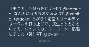 「モニカ」も歌ったぜよーRT @natsuco: なんというカラオケww RT @yohito_teraoka: ちがう!前回のゴールデンサークルの打ち上げで、民生っちとかといって、ジュンスカ、ユニコーン、熱唱しました(笑)RT @owarinakitabi_5: