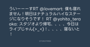 ういーーーすRT @lovemart: 僕も寝れません!明日はナチュラルハイなステージになりそうです! RT @yohito_teraoka: スタジオより帰宅、、、、今日はライブじゃん(>_<)!、、、、寝ないと!