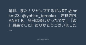 是非、また!ジャンプするぜよRT @hnkm23: @yohito_teraoka  吉祥寺PLANET K。今日は楽しかったです!! 『め』最高でした!! ありがとうございました~