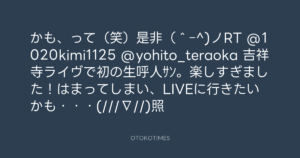 かも、って(笑)是非(^ー^)ノRT @1020kimi1125 @yohito_teraoka 吉祥寺ライヴで初の生呼人サン。楽しすぎました!はまってしまい、LIVEに行きたいかも・・・(///∇//)照